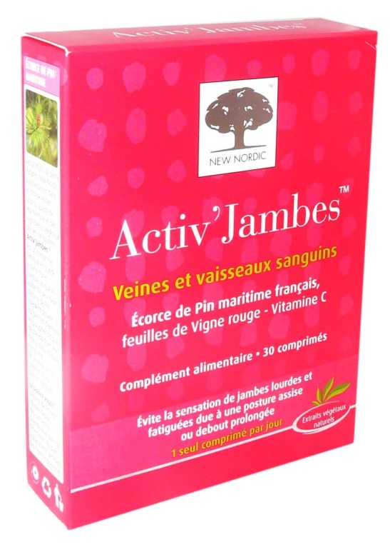 Activ’Jambes du laboratoire NEW NORDIC, est un complément alimentaire à base de vitamine C, qui contribue à la formation normale de collagène utile pour le fonctionnement normal des vaisseaux sanguins, et d’écorce de Pin et de feuilles de vigne, qui soutient la circulation veineuse.