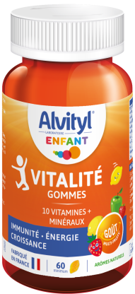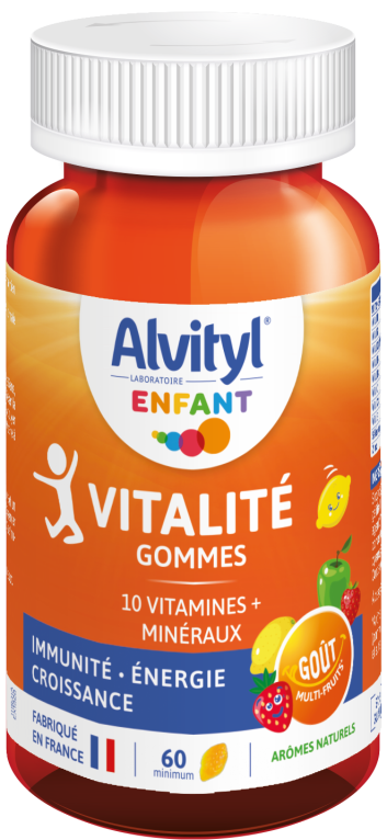 La marque ALVITYL du laboratoire URGO est composée de compléments alimentaires multivitaminés pour le bien-être de tous et un organisme en pleine forme au quotidien. Alvityl Vitalité Gommes est un complément alimentaire sous forme de gommes, qui participe aux apports journaliers en vitamines avec ses 10 vitamines et minéraux. Les vitamines B et C contribuent et aident à réduire la fatigue. Le zinc qui vient compléter cette association de vitamines, contribue au fonctionnement du système immunitaire. Arôme naturel de fruits, adaptés aux enfants à partir de 4 ans.