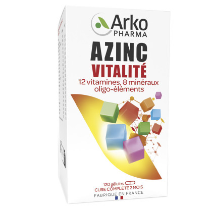 Azinc Vitalité des laboratoires Arkopharma contribue à réduire la fatigue grâce à l'action de la vitamine C, il participe au maintien d'une ossature normale avec le zinc et la vitamine D3. De plus , ces 3 composants aident au fonctionnement normal du système immunitaire. Format 2 mois.