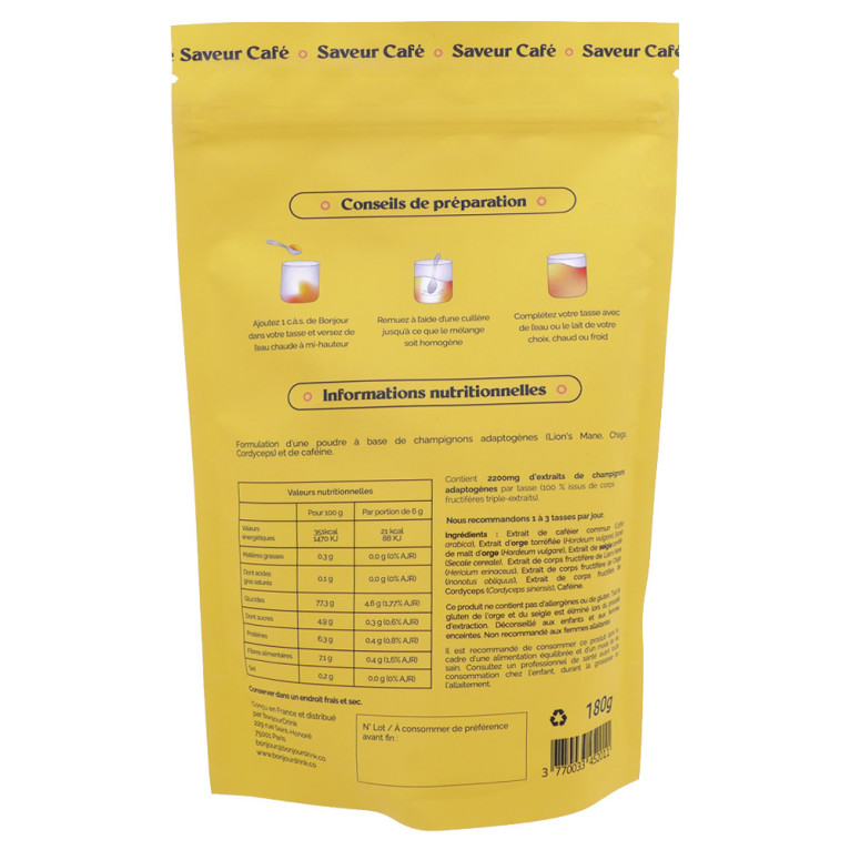 Extrait d’Orge torréfiée (Hordeum vulgare), Café Arabica soluble, Extrait de malt d’Orge (Hordeum vulgare), Extrait de Seigle torréfié (Secale cereale), Extrait de corps fructifère de Lion’s Mane (Hericium erinaceus), Extrait de corps fructifère de Chaga (Inonotus obliquus), Extrait de mycélium de Cordyceps (Cordyceps sinensis), Extrait de grain de café vert (Coffea arabica L.).