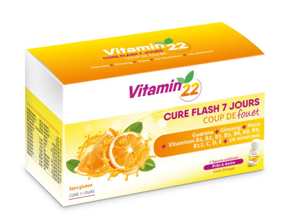VITAMIN 22 CURE FLASH 7 JOURS du laboratoire INELDEA à prix discount, en vente dans votre parapharmacie en ligne discount, un complément alimentaire sans gluten conditionné sous forme de 7 flacons unidoses dosés en vitamines, minéraux et extraits de plantes.