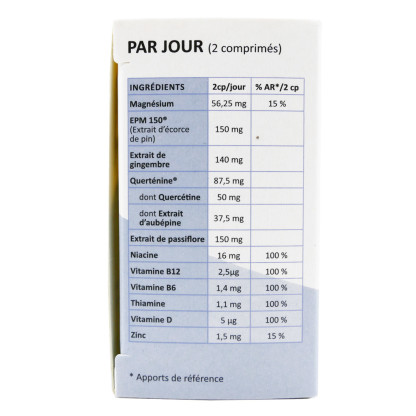 cellulose. Maltodextrine. Extrait d'écorce de pin (Pinus pinaster). Extrait de partie aérienne de passiflore (Passiflora incarnata). Extrait de rhizome de gingembre (Zingiber officinalis). Oxyde de magnésium marin. Quercétine. Epaississant : carboxyméthulcellulose de sodium réticulée. Extrait de feuille d'aubépine (Crataegus laevitaga). Agents d'enrobage : hydroxypropylméthylcellulose, carbonate de magnésium, sulfate de calcium. Nicotinamide (vitamine B3). Agent d'enrobage : hydroxypropylcellulose. Antiagglomérant dioxyde de silicium. Agent d'enrobage : acide stéarique. Citrate de zinc. Cyanocobalamine (vitamine B12). Cholecalciferol (vitamine D). Chlorhydrate de pyridoxiine (vitamine B6). Chlorhydrate de thiamine (vitamine B1). Antiagglomérant : sels de magnésium d'acides gras.