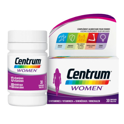 Le laboratoire CENTRUM conçoit des compléments alimentaires pour apporter tous les nutriments nécessaires au quotidien lors des étapes de la vie, destiné à toute la famille. CENTRUM WOMEN est un complément alimentaire sous forme de comprimés destiné aux femmes. Il est composé de vitamines et minéraux adaptés aux besoins nutritionnels de la femme. Sa formule associe du fer et des vitamines du groupes B qui contribuent à réduire la fatigue, des vitamine C, du sélénium et du Zinc qui favorisent le fonctionnement normal du système immunitaire. Le Zinc aide aussi au maintien d'une peau, de cheveux, et d'ongles normaux. Enfin la formule est complétée par du Calcium, de la vitamine D et de la vitamine K qui participent à conserver une ossature normale.