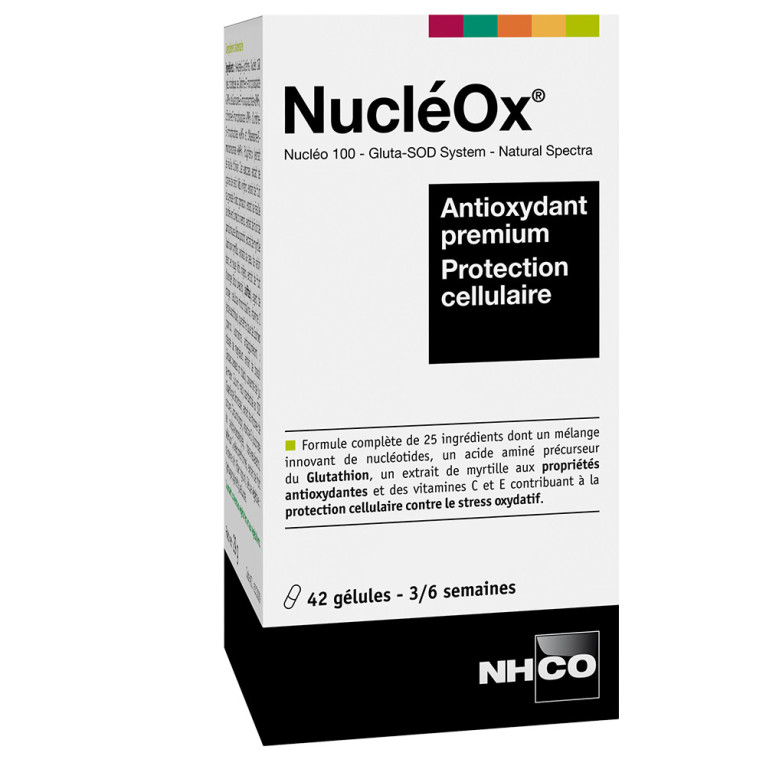NUCLEOX est un complément alimentaire formulé à base de la N-Acétyl-L-Cystéine, un acide aminé précurseur du Glutathion, de la SOD extraite du melon, de l'extrait de myrtille, de la vitamine C & E.