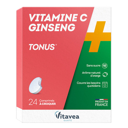 Vitamine C + Ginseng de NUTRISANTE est un complément alimentaire en comprimés à croquer (sans sucre) au goût naturel d'orange qui associe du ginseng et de la vitamine C. Dans cette formule, la vitamine C participe à la réduction de la fatigue, favorise un métabolisme énergétique normal ainsi q'un bon fonctionnement du système immunitaire. Enfin la vitamine C contribue également à protéger les cellules contre le stress oxydatif.