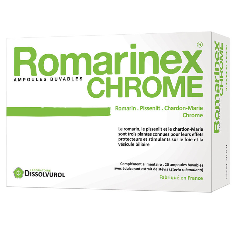 ROMARINEX Chrome des laboratoires DISSOLVUROL à prix discount dans votre parapharmacie en ligne, le complément alimentaire en ampoules à base de plantes dont le romarin, le pissenlit et le chardon Marie qui ensemble contribue à la protection du foie.