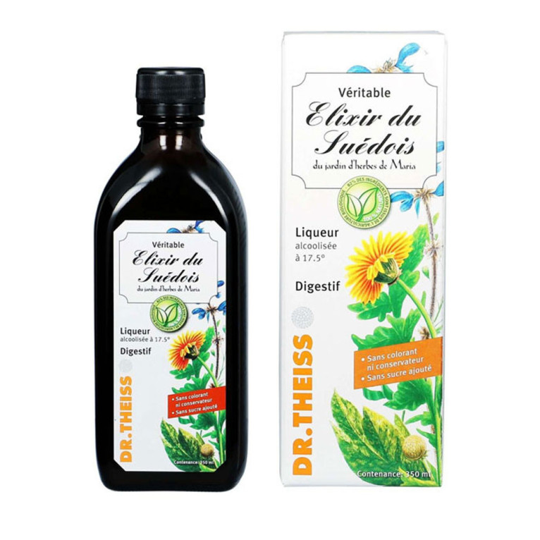 Véritable Elixir du Suédois Digestif du Jardin d’herbes de Maria des Laboratoires du DR.THEISS, l’élixir aux plantes, 100 % d’ingrédients d’origine naturelle.