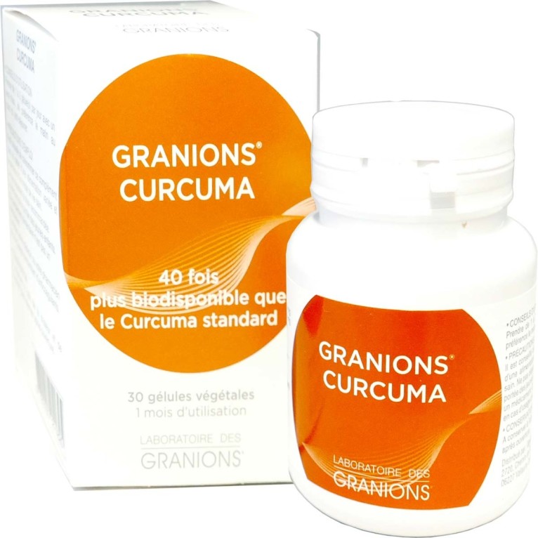 Les laboratoires des GRANIONS du groupe français EA Pharma développent des compléments alimentaires élaborés avec des actifs d'origine naturelle de qualité : plantes, oligoéléments, acides gras, vitamines et minéraux. Les différentes gammes GRANIONS proposent des compléments alimentaires à base d’actifs qui vont aider au fonctionnement de l’organisme. CURCUMA des laboratoires Granions est un complément alimentaire conditionné sous forme de gélules végétales, composé de curcumine qui est extrait du curcuma et de manganèse qui contribue à la formation du tissu conjonctif, comme le cartilage.