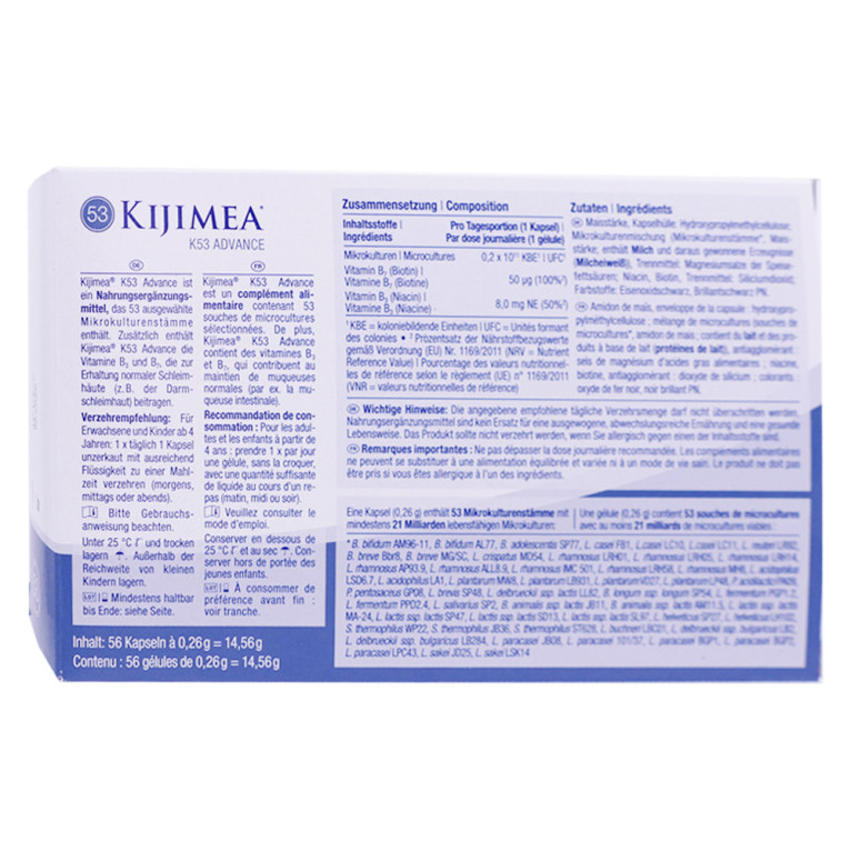 Kijimea® K53 Advance est un supplément nutritionnel composé de 53 souches de micro-organismes choisis. Chaque portion de Kijimea® K53 Advance fournit au minimum 21 milliards de micro-organismes actifs. En outre, ce produit inclut les vitamines B3 et B7, qui contribuent à préserver le bon état des muqueuses, telles que celles de l'intestin.
