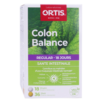 Colon Balance REGULAR Santé intestinale des laboratoires ORTIS est un complément alimentaire en comprimés à alterner matin et soir. Les comprimés du matin sont à base de deux ferments lactiques, le lactobacillus et le bifidobacterium. Les comprimés du soir associent des extraits de plantes comme la mélisse et le curcuma. Dans cette formule la mélisse va contribuer à soutenir la digestion et va aider en cas de ballonnements et de flatulences. Programme de 18 jours.