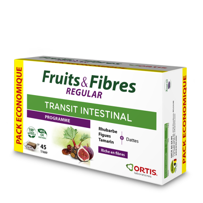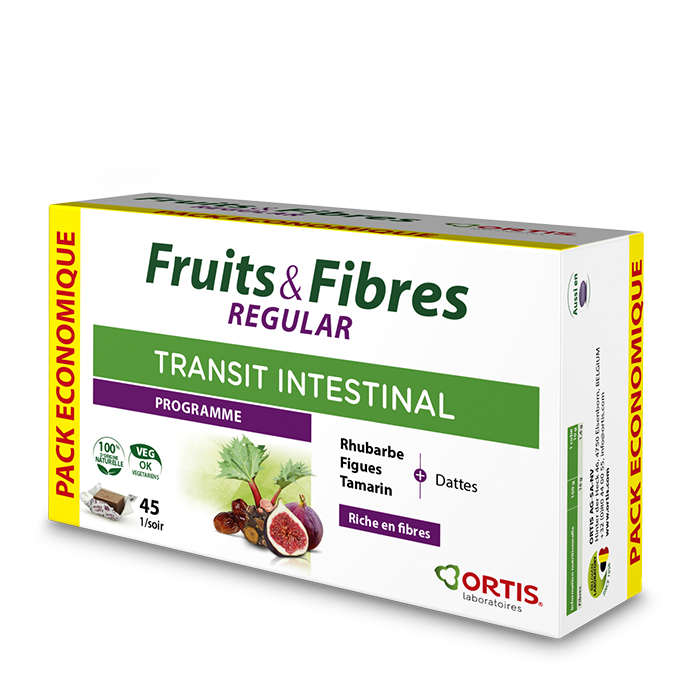 FRUITS & FIBRES Regular Transit Intestinal d’ORTIS sont des cubes, spécialement conçus à base de rhubarbe qui aide à favoriser un transit intestinal régulier, du tamarin qui est reconnu pour faciliter le transit par un effet de lest, de la figue qui contribue à une bonne santé intestinale. Des dattes sont également rajouté à la composition de ces cubes qui sont adaptés pour les végétariens.