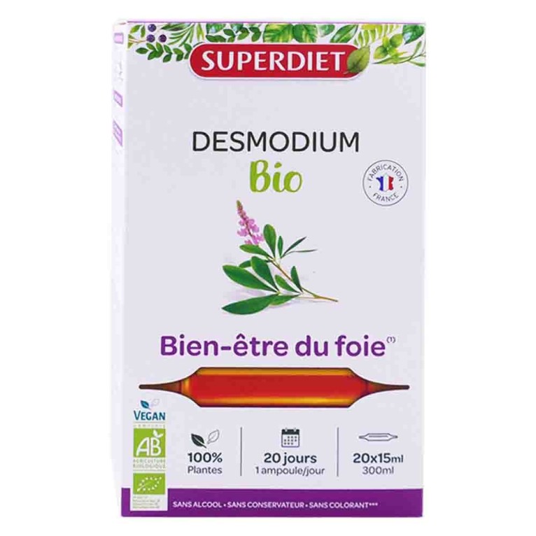SUPERDIET propose une large gamme de compléments alimentaires à la fois efficaces et sûrs, élaborés avec des plantes issues majoritairement de l’agriculture biologique, pour offrir le meilleur de la nature et apporter des solutions naturelles à tous nos besoins santé et bien-être. DESMODIUM Bio, conditionné en ampoule qui offre chacune l’équivalent de 600 mg de plantes sèches, sans alcool, sans conservateur ni colorant, est un complément alimentaire destiné à améliorer le fonctionnement hépatique. Le desmodium est une plante originaire des zones équatoriales d’Afrique et d’Amérique latine traditionnellement utilisée pour ses propriétés drainantes du système hépatique.