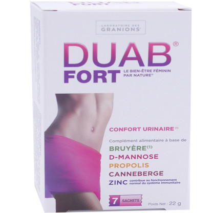 DUAB FORT est un complément alimentaire sous forme de sachet, à base de D-Mannose qui est un sucre présent à la surface des cellules humaines, de la bruyère qui est utilisée pour contribuer aux fonctions normales d'élimination urinaire et de propolis d’origine naturelle. Le zinc qui complète cette formule participe au fonctionnement normal du système immunitaire de l’organisme.