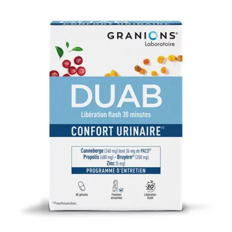 DUAB à prix discount des laboratoires GRANIONS, le complément alimentaire en gélules à base de Propolis, Canneberge et Zinc, dans votre parapharmacie en ligne à prix discount.