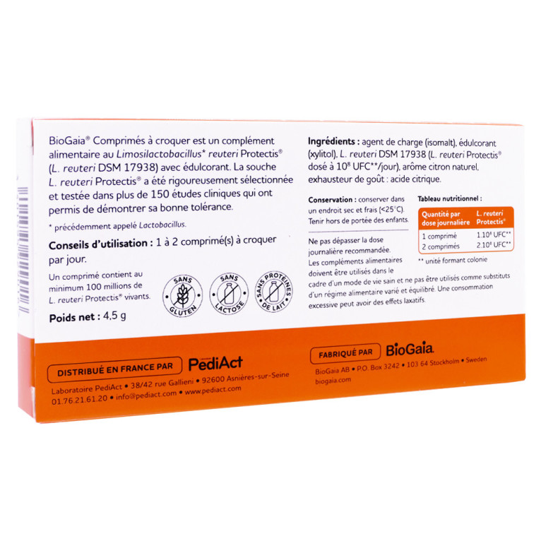 Ingrédients par dose journalière (1 comprimé) : Agent de charge : isomalt, édulcorant : xylitol, Limosilactobacillus reuteri DSM 17938 (Limosilactobacillus reuteri Protectis® dosé à 10⁸ UFC* par jour), arôme citron, exhausteur de goût : acide citrique.