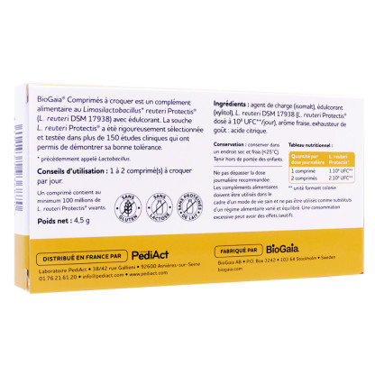 1 comprimé contient au minimum 100 millions de bactéries Limosilactobacillus reuteri DSM 17938 vivantes.*UFC = unité formant colonie