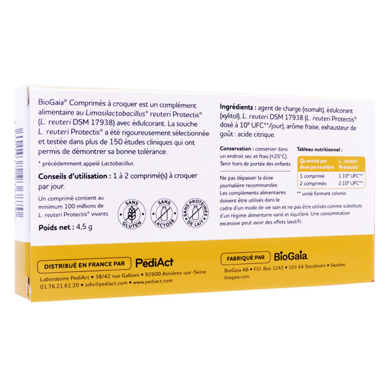Ingrédients par dose journalière (1 comprimé) : Agent de charge : isomalt, édulcorant : xylitol, Limosilactobacillus reuteri DSM 17938 (Limosilactobacillus reuteri Protectis® dosé à 10⁸ UFC* par jour), arôme fraise, exhausteur de goût : acide citrique.