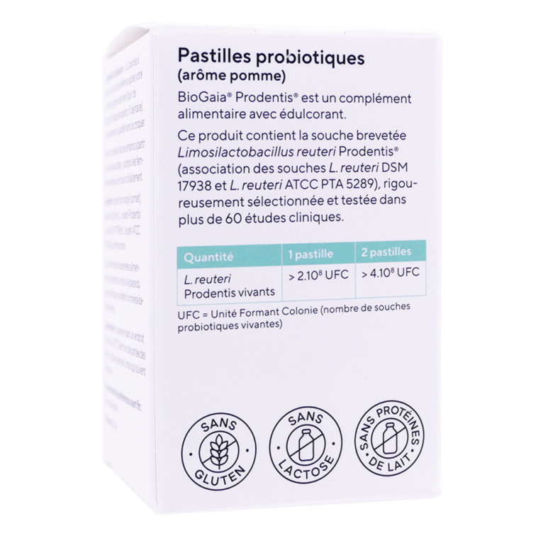 Ingrédients pour 1 pastille : agent de charge (isomalt), édulcorant (xylitol), Limosilactobacillus reuteri Prodentis® (L. reuteri DSM 17938 et L. reuteri ATCC PTA 5289) dosé à 2.10⁸ UFC* par jour, arôme pomme.Une pastille contient au minimum 200 millions de bactéries L. reuteri Prodentis® vivantes.*UFC = unité formant colonie