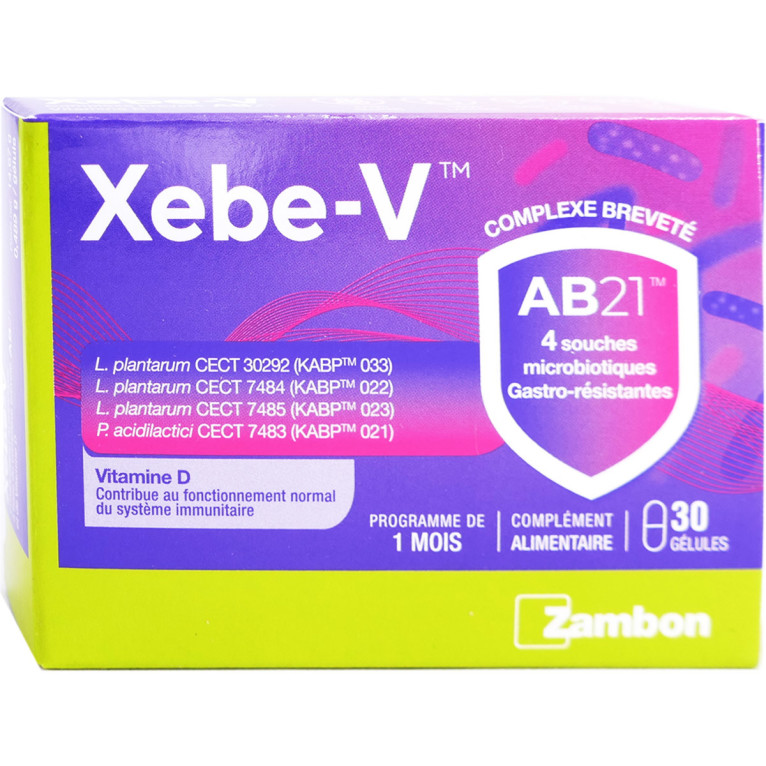 Xebe-V du laboratoire ZAMBON est un complément alimentaire présenté sous forme de gélules, à base d’un complexe unique et breveté AB21 composé de 4 souches de ferments lactiques, ainsi que de vitamine D. La vitamine D contribue au fonctionnement normal du système immunitaire. Le complexe unique et breveté des ferments lactiques est résistant à l’acidité gastrique et biliaire afin de les protéger de l'acidité gastrique et s’assurer qu’elles atteignent vivantes l'intestin pour une action optimale.