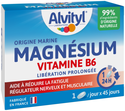 Ce complément alimentaire, proposé par le laboratoire Alvityl, associe du magnésium et de la vitamine B6. Le magnésium (origine marine) et la vitamine B6 aident tous les deux à réduire la fatigue. De plus, ils contribuent ensemble à maintenir une fonction psychologique normale. Pour finir, le magnésium contribue à la fonction musculaire normale. Les comprimés à libération prolongée permettent une diffusion progressive des actifs pour une efficacité optimale.