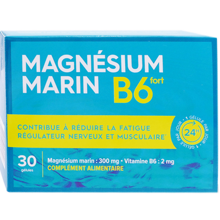 MAGNESIUM MARIN B6 FORT est un complément alimentaire composé de magnésium marin et de vitamines B6. Chaque gélules apporte 300 mg de magnésium marin associé à de la vitamine B6. Le magnésium et la vitamine B6 contribuent à réduire la fatigue, ainsi qu'au fonctionnement normal du système nerveux. Le magnésium participe également à une fonction musculaire normale.