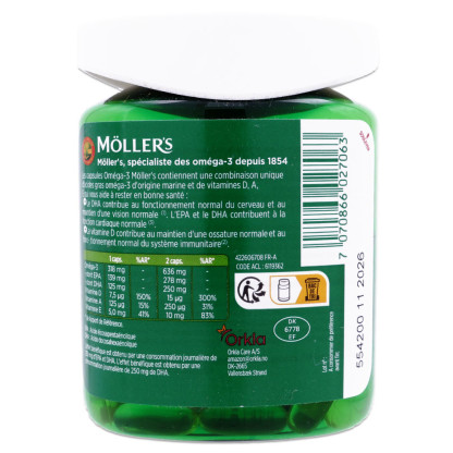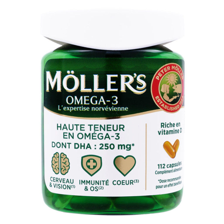 La marque Möller’s propose des compléments alimentaires à base d’oméga 3 de haute qualité issu de l’huile de foie de morue principalement, pour le bien-être de toute la famille au quotidien. OMEGA-3 est un complément alimentaire conditionné sous forme de capsules, composé d’huiles de poissons sauvages naturellement riches en acides gras essentiels omégas-3. Cette huile est concentrée en acide Eicosapentaénoïque (EPA) et acide Docosahexaénoïque (DHA) qui participent au fonctionnement normal du cœur mais également du cerveau et des yeux. Les vitamines A et D renforcent la formule pour assurer le maintien d'une ossature normale et participer au fonctionnement normal du système immunitaire.
