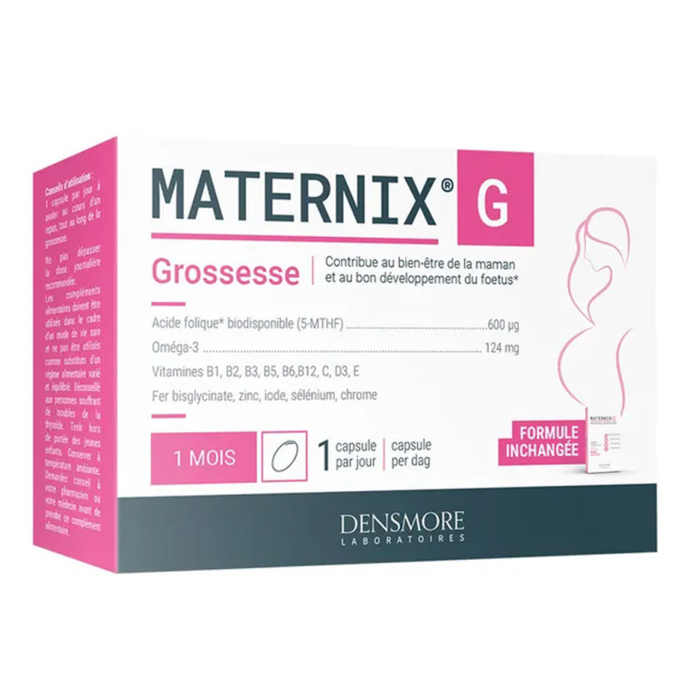 Maternix G Grossesse du laboratoire DENSMORE, le complément alimentaire composé de plantes et de vitamines, en capsules, dans votre parapharmacie en ligne à prix discount.