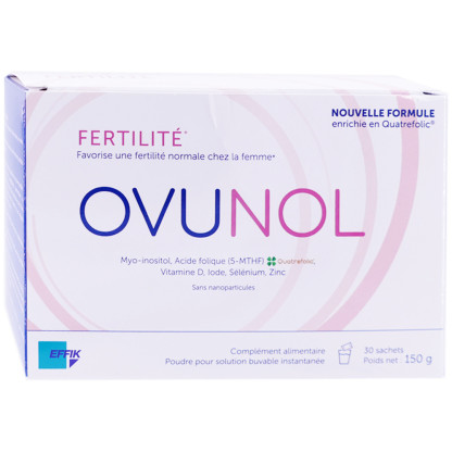 OVUNOL FERTILITE contient une combinaison unique d'ingrédients naturels soigneusement sélectionnés pour leurs propriétés bénéfiques sur la fertilité. Sa formule exclusive associe des oligo-éléments, des vitamines et des minéraux essentiels pour optimiser la santé reproductive : myo-inositol, folates, iode, sélénium, vitamine D et zinc. Grâce au zinc, OVUNOL FERTILITE contribue à une fertilité et une reproduction normales ; associé au sélénium, il contribue à la protection des cellules contre le stress oxydatif. Un apport supplémentaire en acide folique* augmente le statut folate de la mère. Un faible taux de folate maternel est un facteur de risque de développement d'anomalies du tube neural chez le fœtus en développement. Les sachets pratiques d'OVUNOL FERTILITE permettent une utilisation facile et hygiénique. Il vous suffit de diluer un sachet dans un verre d'eau chaque jour pour bénéficier de tous les bienfaits de ce complément alimentaire. Optez pour OVUNOL FERTILITE et donnez un coup de pouce à votre fertilité. Profitez de son efficacité prouvée et de sa formule naturelle pour augmenter vos chances de concevoir. Commandez dès maintenant sur notre site de vente en ligne et bénéficiez de prix discount sur ce produit de qualité.