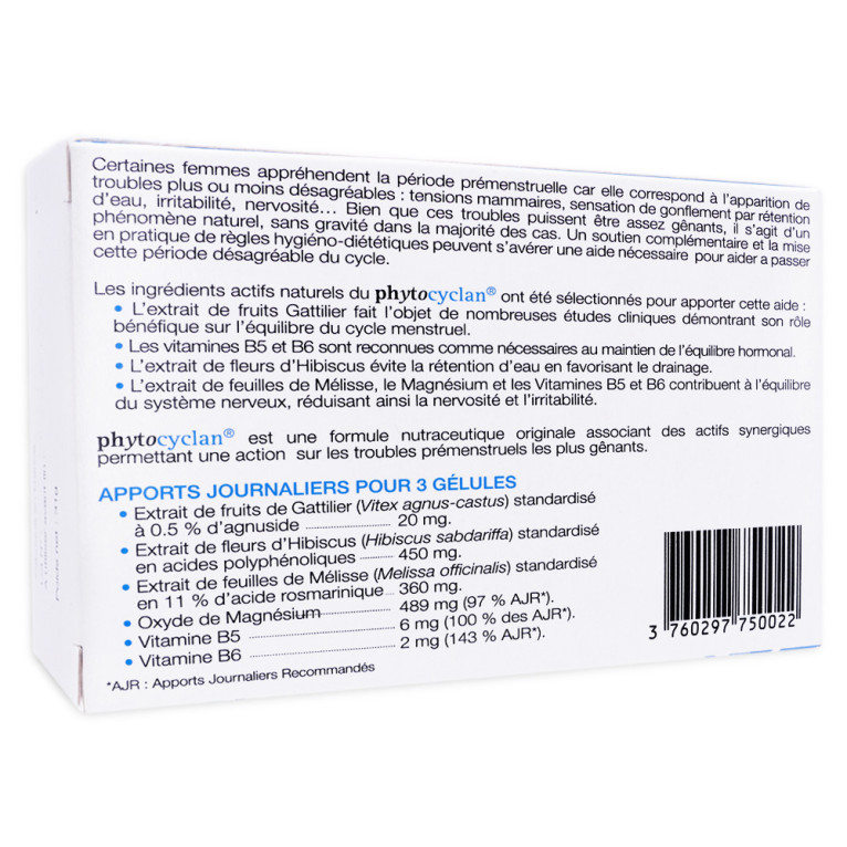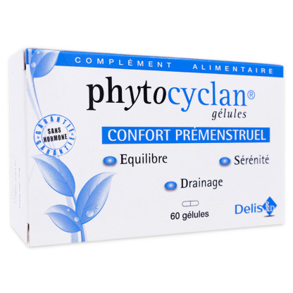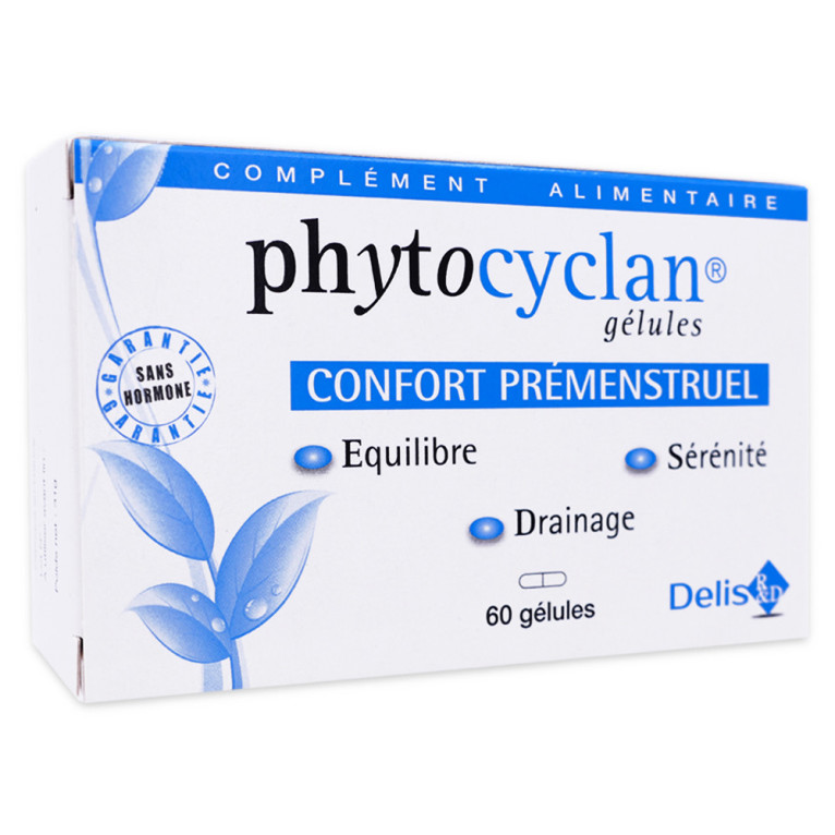 PHYTOCYLAN Confort prémenstruel est un complément alimentaire sous forme de gélules à avaler, composé d’extraits de plantes (fruit de gattillier mélisse, hibiscus) magnésium et vitamines B. Dans cette formule la vitamine B6 participe à la régulation de l'activité hormonale, l'hibiscus est utilisé pour le drainage de l'organisme, le fruit de gattilier participe à l'équilibre hormonal et nerveux et la mélisse contribue à diminuer la nervosité et l'irritabilité. Enfin le magnésium et la vitamine B6 quant à eux participent au fonctionnement normal du système nerveux.