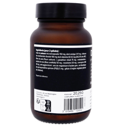 Pour 2 gélules : Huile de POISSON microencapsulée 150 mg, dont oméga-3 47 mg ; chlorure de nicotinamide riboside 100 mg dont vitamine B3 42 mg (262,5 % des AR*) ; fibre de pois (Pisum sativum) ; L-glutathion réduit 75 mg ; maltodextrine ; extrait de rose (Rosa centifolia) 50 mg ; resvératrol 30 mg ; coenzyme Q10 30 mg ; anti-agglomérant : sels de magnésium d’acides gras ; sel disodique de pyroloquinoline-quinone (PQQ) 5 mg ; gélule d’origine végétale (dérivé de cellulose). *Apports de référence.