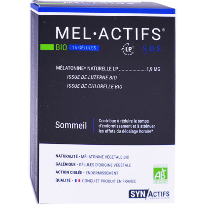 MEL ACTIFS est un complément alimentaire à base de mélatonine naturelle à libération prolongée dosée à 1.9 mg.Cette mélatonine est issue de la luzerne et de la chlorelle, toutes deux d'origine biologique.La mélatonine dosée à 1mg favorise un sommeil normal, participe à s'endormir de façon naturelle.Elle contribue à la réduction des effets du décalage horaire dès 0.5mg.