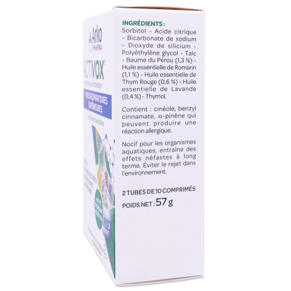 Activox sont des comprimés pour inhalation sous forme de comprimés à dissoudre, à base d’huiles essentielles de romarin, thym rouge et lavande, associé à un extrait de baume du Pérou. L'huile essentielle de thym va participer à l'apaisement des cordes vocales, de la gorge et du pharynx.