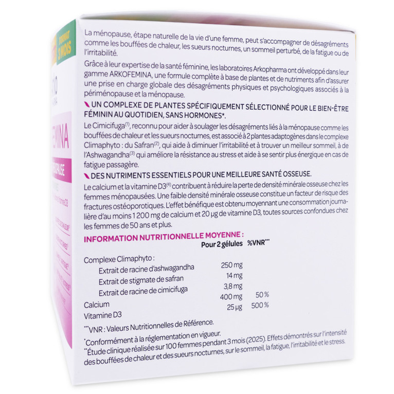 ARKOFEMINA Confort Ménopause contient le Complexe Climaphyto, une combinaison de plantes telles que le cimicifuga, le safran et l'ashwagandha. Le cimicifuga contribue à atténuer les signes associés à la ménopause (tels que bouffées de chaleurs, sueurs nocturnes), tandis que le safran contribue à diminuer l'irritabilité et à traouver un meilleur sommeil, et l'ashwagandha améliore la résistance au stress du corps et contribue à se sentir plus énergique en cas de fatigue passagère. Le calcium et la vitamine D3 sont inclus pour soutenir le maintien d'une ossature normale. Ce complément alimentaire est sans hormones, respectant ainsi les besoins naturels du corps.