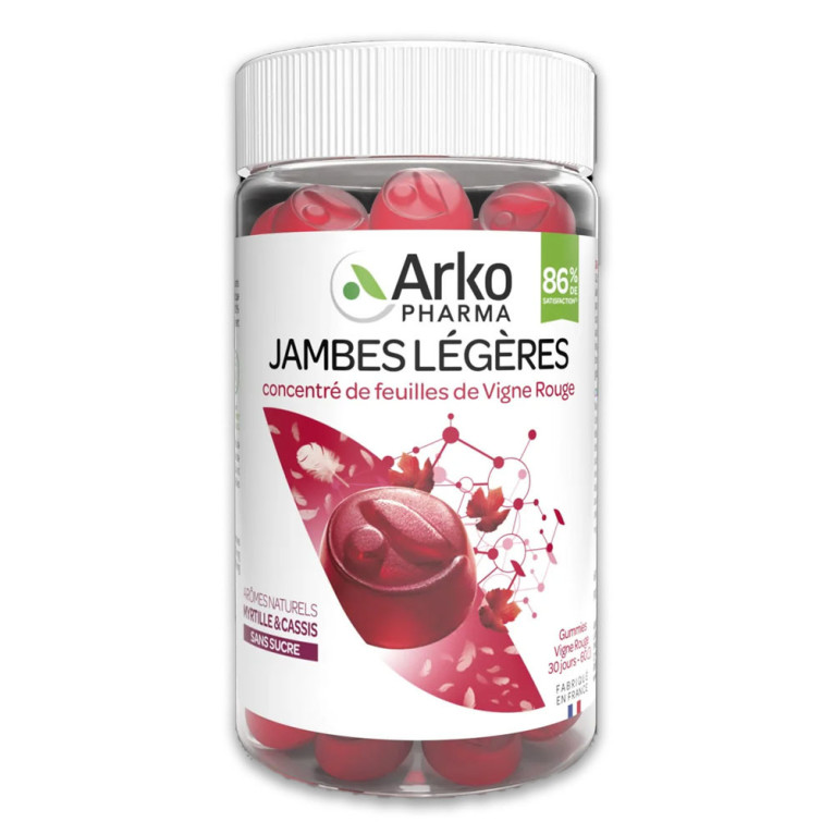 Découvrez les gummies ARKOPHARMA JAMBES LEGERES, conçus à partir de feuilles de vignes rouges qui soulage les jambes lourdes, favorise le retour veineux pour des jambes et des veines saines et contribue à une bonne circulation sanguine dans les jambes. Ces délicieux gummies sont formulés sans sucre, avec un délicieux goût de myrtille et de cassis. Ils sont sans gluten, sans lactose et vegan.