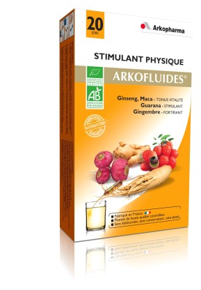 Arkofluide stimulant améliore la résistance physique et les performances intellectuelles, et redonne du tonus grâce au ginseng qui est une plante riche en ginsénosides, au jus d'argousier qui est riche en acides aminés et en minéraux, au guarana qui est riche en caféine ainsi qu'à l'acérola qui est une petite cerise des Antilles.