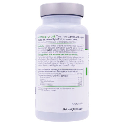 Extrait de feuille de menthe poivrée Mentha x piperita L. (maltodextrine) ; Agent de charge (cellulose microcristalline) ; Enveloppe de la gélule d’origine végétale (agent d’enrobage : hydroxypropylméthylcellulose) ; Complexe d’enzymes (alpha-amylase, lactase, protéase, lipase, cellulase) (maltodextrine) ; Anti-agglomérants (carbonate de magnésium, sels de magnésium d’acides gras).