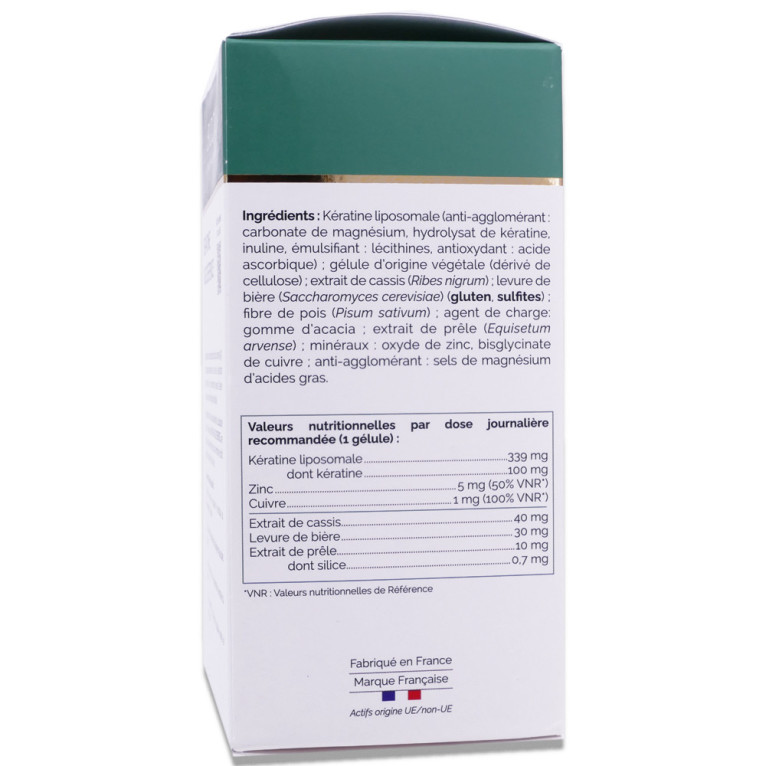 INGRÉDIENTS : Kératine liposomale (anti-agglomérant : carbonate de magnésium, hydrolysat de kératine, inuline, émulsifiant : lécithines, antioxydant : acide ascorbique) ; gélule d’origine végétale (dérivé de cellulose) ; extrait de cassis (Ribes nigrum) ; levure de bière (Saccharomyces cerevisiae) (GLUTEN, SULFATES) ; fibre de pois (Pisum sativum) ; agent de charge: gomme d’acacia ; extrait de prêle (Equisetum arvense) ; minéraux : oxyde de zinc, bisglycinate de cuivre ; anti-agglomérant : sels de magnésium d’acides gras.