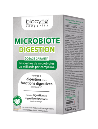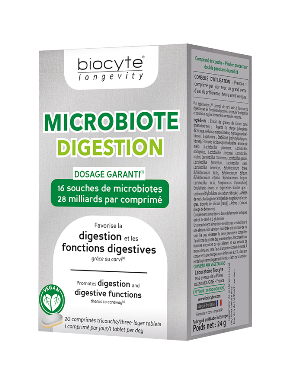 BIOCYTE créé en 2006 est un laboratoire qui conçoit des compléments nutritionnels innovants et de qualité grâce à un savoir-faire unique dans le soin de soi. La microbiote est l’ensemble des bactéries non pathogènes présent dans notre organisme. Un élément essentiel qui va permettre l’assimilation des nutriments, la synthèse des vitamines ainsi que l’absorption des minéraux. MICROBIOTE DIGESTION est un complément alimentaire sous forme de comprimés tri couches qui associe des souches de ferments lactiques et l’extrait de graine de carvi qui va participer à soutenir les fonctions du système digestif.