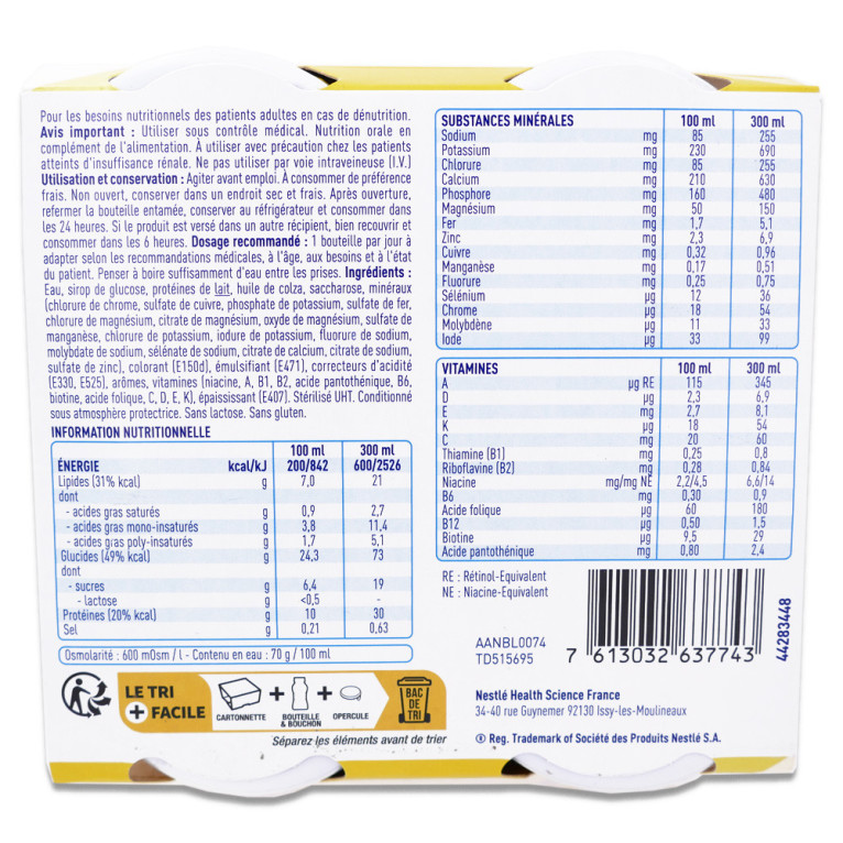 Prendre 1 bouteille par jour à adapter selon les recommandations médicales, à l'âge, aux besoins et à l'état du patient. Vous pouvez le consommer en plusieurs fois, tout au long de la journée durant les repas ou lors de collation. La boisson peut être congelée dans un récipient adapté afin d'être consommée comme crème glacée.