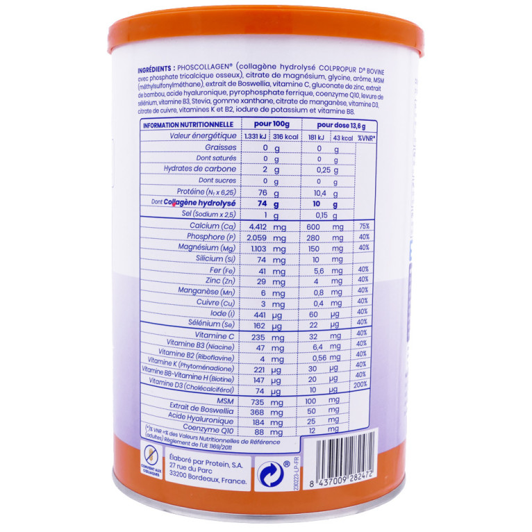 Phoscollagen® (Collagène hydrolysé Colpropur D® Bovine avec phosphate tricalcique osseux), Citrate de magnésium, Glycine, Arôme de pêche, MSM (Méthylsulfonylméthane), Extrait de boswellia, Vitamine C, Gluconate de zinc, Extrait de bambou, Acide hyaluronique, Pyrophosphate ferrique, Coenzyme Q10, Levure de sélénium, Vitamine B3, Stévia, Gomme xanthane, Citrate de manganèse, Citrate de cuivre, Vitamine D3, B2 et K, Iodure de potassium, Vitamine B8.