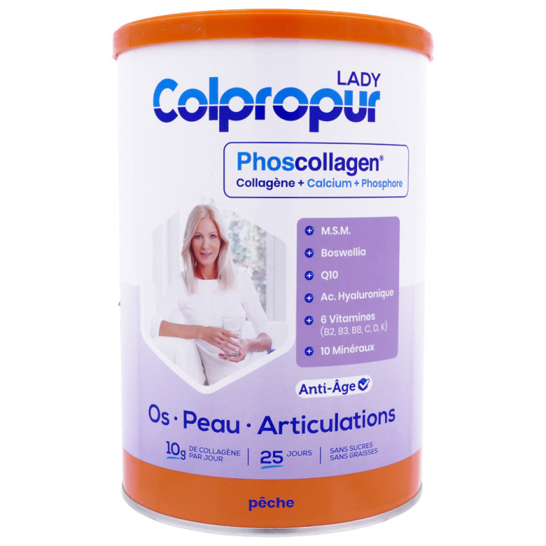 Présent naturellement dans notre organisme, le COLLAGÈNE est notamment l’un des principaux composants des articulations, des os et de la peau. COLPROPUR Lady Phoscollagen est un complément alimentaire composé d'un complexe collagène + phosphate de calcium, de vitamines (D, C, K, B2, B3, B8), de minéraux (Fe, Si, Cu, Se, Zn, I, Mn, Mg), de MSM, Boswellia et de Phoscollagen®.