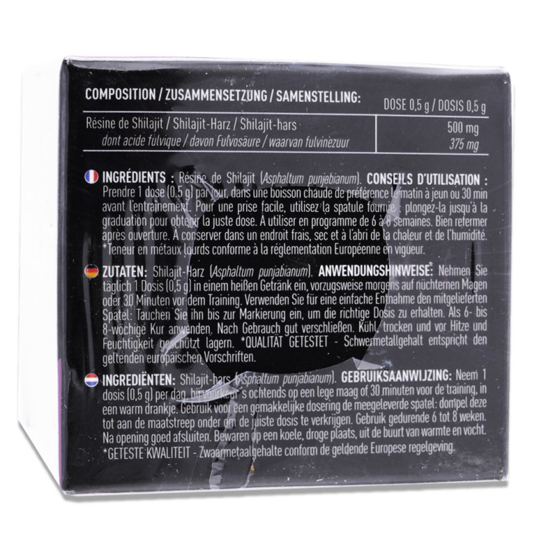 Par dose de 0,5g : Résine de Shilajit 500 mg dont acide fulvique 375 mg