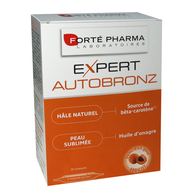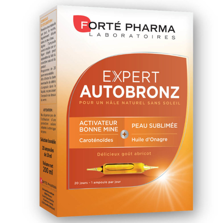 Depuis 1999, les Laboratoires FORTÉ PHARMA développent des compléments alimentaires efficaces et innovants, aux formules issues de la recherche en nutrition cellulaire, pour contribuer à renforcer les ressources vitales des utilisateurs. L’univers beauté de FORTÉ PHARMA propose des produits conçus pour améliorer la beauté de la peau, des ongles et des cheveux. EXPERT AUTOBRONZ de FORTÉ PHARMA est un complément alimentaire conditionné sous forme d’ampoules, spécialement formulé pour offrir un joli teint et une bonne mine toute l’année même sans soleil. La formule innovante de EXPERT AUTOBRONZ associe un extrait de carotte, un extrait de tomate, du béta-carotène qui confèrent un teint hâlé à la peau, des vitamines A et E antioxydantes et de l’huile d’onagre sublimante. Au goût abricot, ces ampoules se prendront avec plaisir !