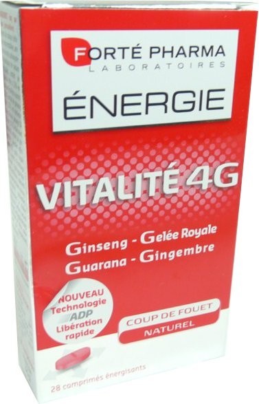 Depuis 1999, les Laboratoires FORTÉ PHARMA développent des compléments alimentaires efficaces et innovants, aux formules issues de la recherche en nutrition cellulaire, pour contribuer à renforcer les ressources vitales des utilisateurs. L’univers énergie de FORTÉ PHARMA propose des produits conçus pour rétablir le tonus, la vitalité, la forme physique et intellectuelle. VITALITE 4G de FORTÉ PHARMA est un complément alimentaire conditionné sous forme de comprimés, spécialement formulé pour booster l’énergie, stimuler les performances physiques et intellectuelles, combattre les états de fatigue. La formule innovante de VITALITE 4G est composée d’un complexe spécifique d’actifs végétaux : du Ginseng appelé également « remède universel », du Guarana tonifiant, de la Gelée Royale : concentré nutritif issu de la ruche, du Gingembre aux propriétés antioxydantes, et de la vitamine B5 qui contribue à réduire la fatigue.