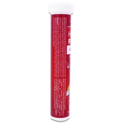 Analyse nutritionnelle : Teneur pour 1,5 L de boisson reconstituée avec 2 comprimés : Énergie : 100 kJ/23,6 kcal ; Matières grasses dont acides gras saturés : 0g ; 0 g ; Glucides : 5,7 g, dont sucres : 2,6 g ; Fibres alimentaires : < 0,1 g ; Protéines : 0 g ; Sel : 1,0 g ; Taurine : 100 mg ; Vitamine C : 1000 mg [1250% VNR] ; Potassium : 300 mg [15% VNR] ; Magnésium : 120 mg [32% VNR] ; Manganèse : 0,4 mg [20% VNR] ; Sodium : 340 mg ; Vitamine D : 50 µg [1000% VNR].. VNR : Valeurs Nutritionnelles de Référence