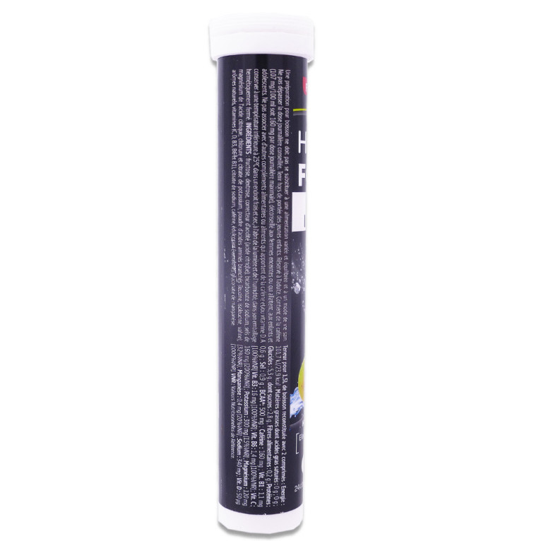 INGRÉDIENTS : fructose, dextrose, correcteur d’acidité (acide citrique), bicarbonate de sodium, sels de magnésium de l'acide citrique, chlorure et citrate de potassium, poudre d’acides aminés branchés (leucine, isoleucine, valine), arômes naturels, vitamines (C, D, B3, B6 et B1), citrate de sodium, caféine, édulcorant (sucralose), gluconate de manganèse