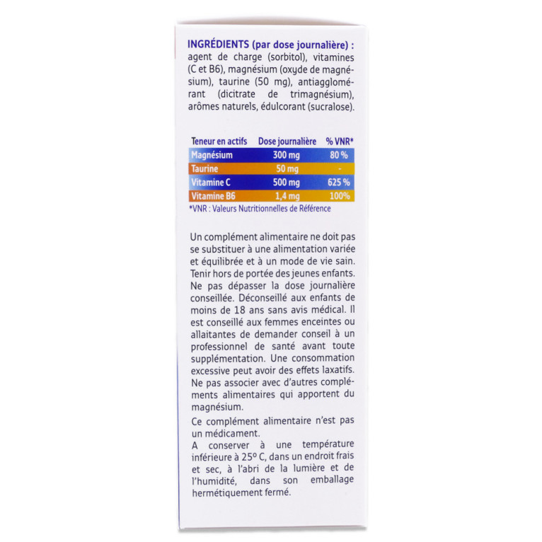Complément alimentaire à base de vitamines, minéraux et taurine. INGRÉDIENTS (par dose journalière) : agent de charge (sorbitol), vitamines (C et B6), magnésium (oxyde de magnésium), taurine (50 mg), correcteur d’acidité (acide citrique), arômes naturels, édulcorant (sucralose).