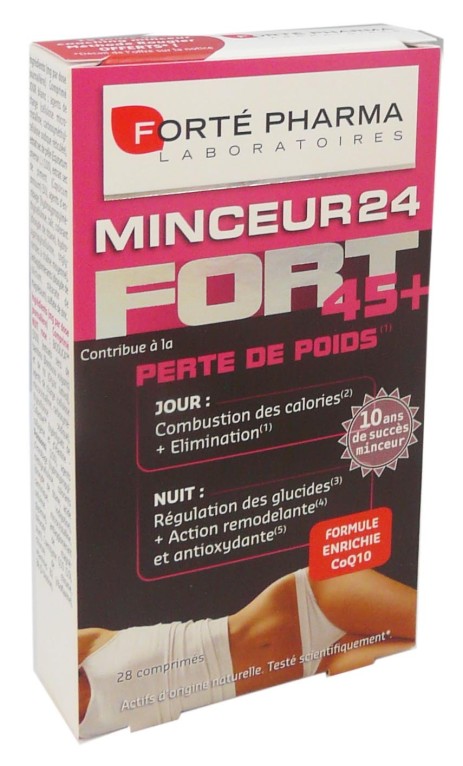 Depuis 1999, les Laboratoires FORTÉ PHARMA développent des compléments alimentaires efficaces et innovants, aux formules issues de la recherche en nutrition cellulaire, pour contribuer à renforcer les ressources vitales des utilisateurs. L’univers minceur de FORTÉ PHARMA propose des produits conçus pour favoriser la perte de poids en complément d’une alimentation adaptée et d’une activité sportive. MINCEUR 24 FORT 45+ de FORTÉ PHARMA est un complément alimentaire conditionné sous forme de deux types de comprimés à prendre le matin et le soir, spécialement formulé pour favoriser la perte de poids et assurer une action minceur globale de jour comme de nuit chez les femmes après 45 ans. La formule innovante de MINCEUR 24 FORT 45+ associe dans le comprimé JOUR de la prêle qui stimule les fonctions d’élimination, du piment brûleur de graisses et du zinc qui participe au bon métabolisme des acides gras. Le comprimé nuit est composé de chrome pour maintenir une glycémie normale et réguler l’assimilation des sucres pendant la nuit. La formule est complétée par du BiosilicaTM, du collagène, de l’élastine, des vitamines B2, B8 et un CoQ10 pour participer au raffermissement de la peau et à la protection cellulaire globale de l’organisme.