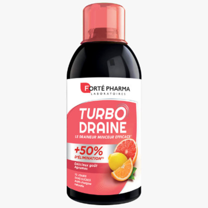 TURBODRAINE de FORTÉ PHARMA Goût Agrumes est un complément alimentaire conditionné sous forme de solution buvable à diluer, spécialement formulé à base de Reine des Prés qui favorise les fonctions d’élimination rénale et de Thé vert qui stimule le métabolisme des graisses et aide à brûler les graisses. Cette formule innovante de TURBODRAINE associe au Thé vert et à la Reine des Prés d’autres extraits de plantes : l’hibiscus pour drainer l’organisme et diminuer la sensation de jambes lourdes ; la queue de cerise qui facilite les fonctions d’éliminations de l’organisme ; et du ginseng pour le bon fonctionnement du système immunitaire. Grâce à son goût agréable, TURBODRAINE se boit sans effort tout au long de la journée. Sans colorants, sans sucres