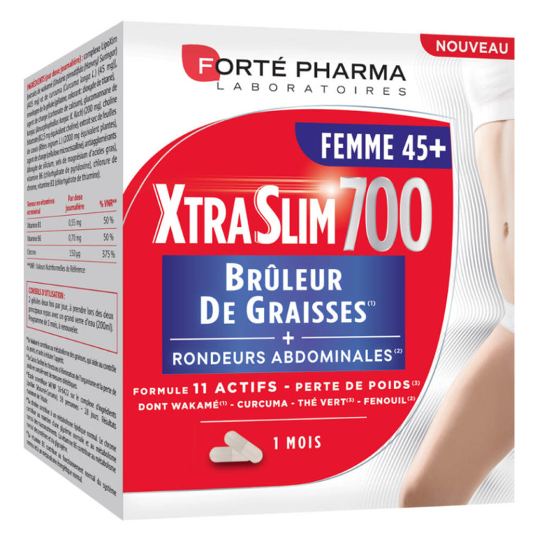 XtraSlim 700 Brûleur de Graisses Femme 45+ de FORTÉ PHARMA est un complément alimentaire conditionné sous forme de gélules spécialement formulé pour les femmes de 45 ans et plus pour les aider à perdre du poids, surtout au niveau de la ceinture abdominale. Une action minceur qui va agir sur les graisses. La formule innovante de XtraSlim 700 Brûleur de Graisses Femmes 45+ associe 4 extraits de plantes (curcuma, wakamé, Thé vert, Café vert) à 2 actifs (Fenouil, Chicorée). Le wakamé contribue au métabolisme des graisses, aide au contrôle du poids et aide à réduire l’appétit et le thé vert aide à bruler les graisses. Le fenouil soutient la digestion. La formule est complétée par de l’acide hyaluronique et par 3 ingrédients complémentaires que sont la choline, le chrome et la vitamine B6. La choline contribue à un métabolisme lipidique normal. Le chrome contribue au maintien d'une glycémie normale et au métabolisme normal des macronutriments. La vitamine B6 contribue au métabolisme normal des protéines et du glycogène et réduit la fatigue. La vitamine B1 qui est ajoutée contribue au fonctionnement normal du système nerveux et à un métabolisme énergétique normal.